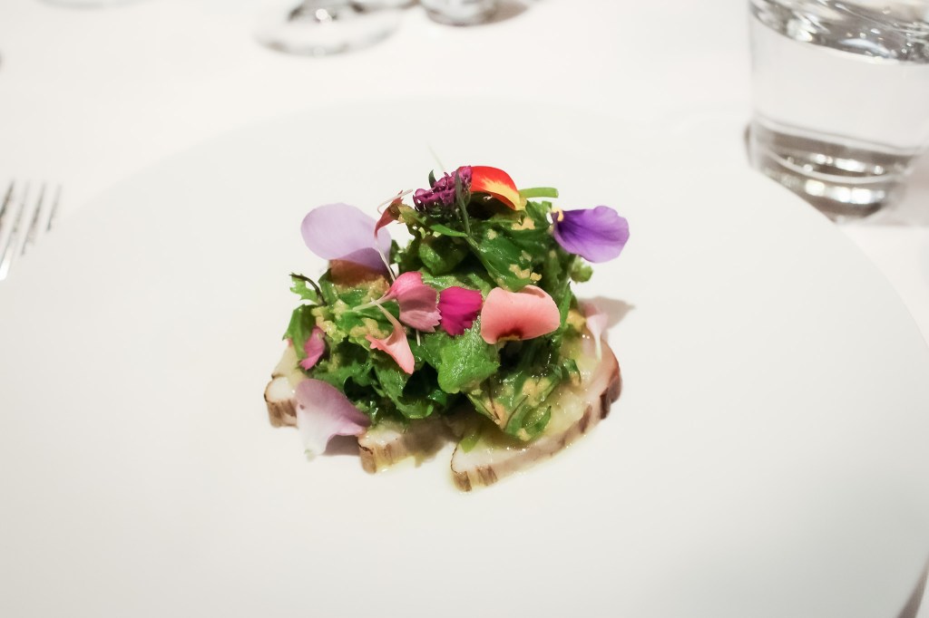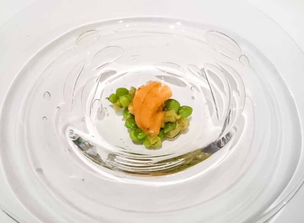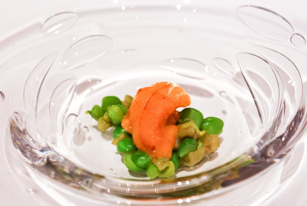 好的,第一潛在在享用完麵包後而端上,這一道前菜相當海味,是用一道北海道海膽加上些青豆與日本當地特色蔬菜製作。相當精緻,而且適量,有如一到海味沙拉盤。