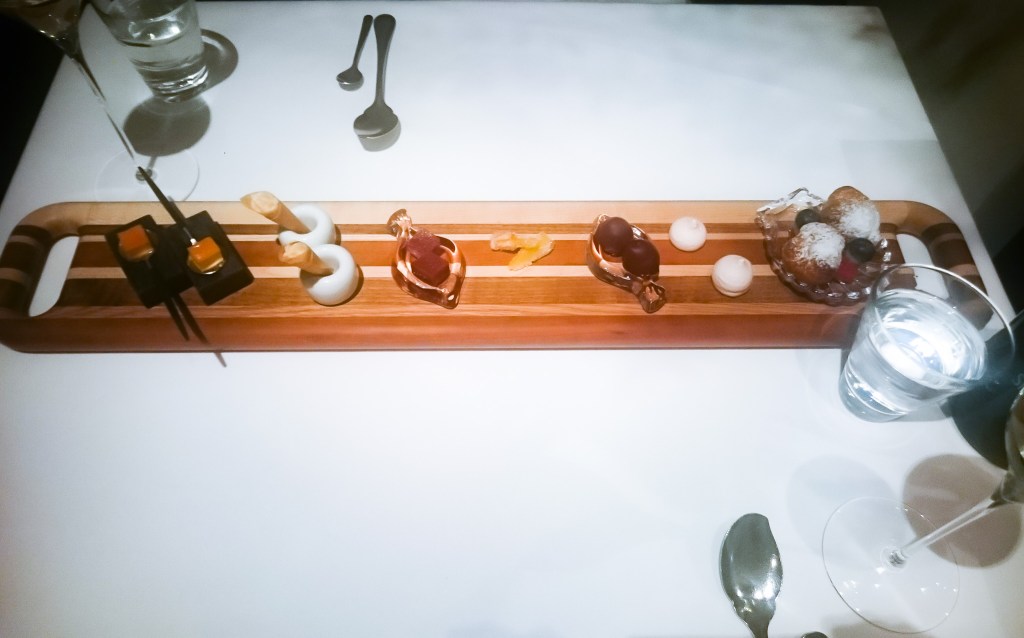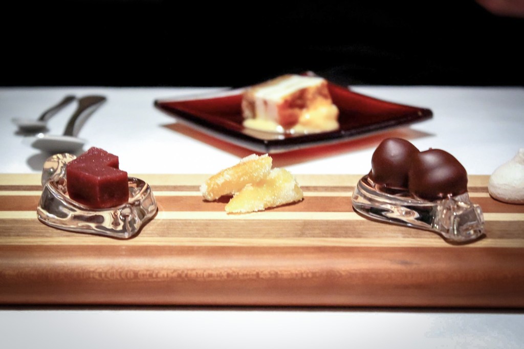 看看最後搭飲品的茶點,有熟布丁、春捲式的起士點心、莓果味的軟式糕點、橙皮法式軟糖、爆醬巧克力、蛋白餅以及水果泡芙,這實在太精彩了。