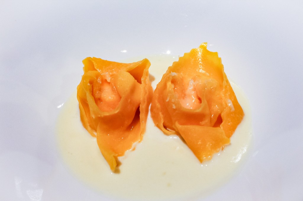 第三道前菜是一道義大利麵餃,這到麵餃裡頭包著起士,而這道菜大概採用四種起士製作,例如馬佐拉、卡門貝爾、乾酪以及馬斯卡彭等,吃下,滑溜麵皮,香濃美味的香濃起司,果然名符其實是一道餐廳的特別料理。搭配Prosecco,理所當然的美味,滑順。