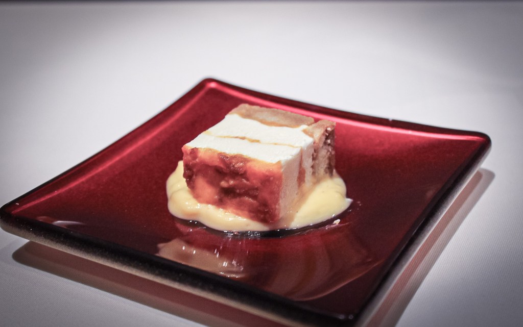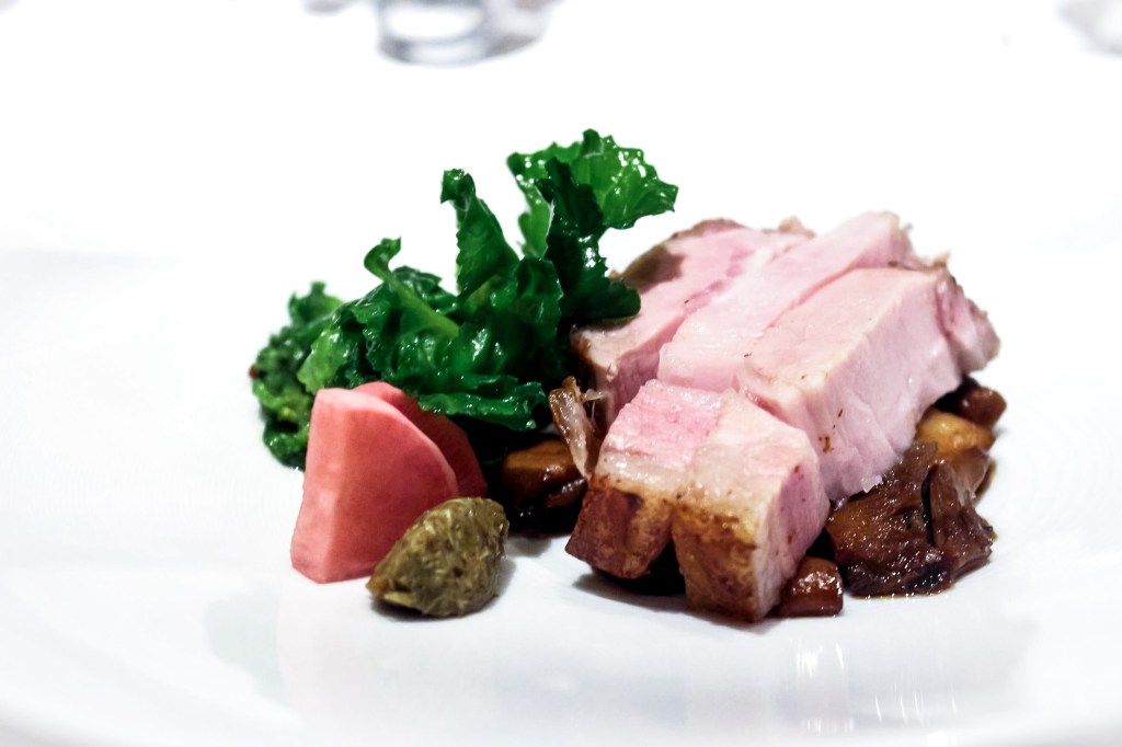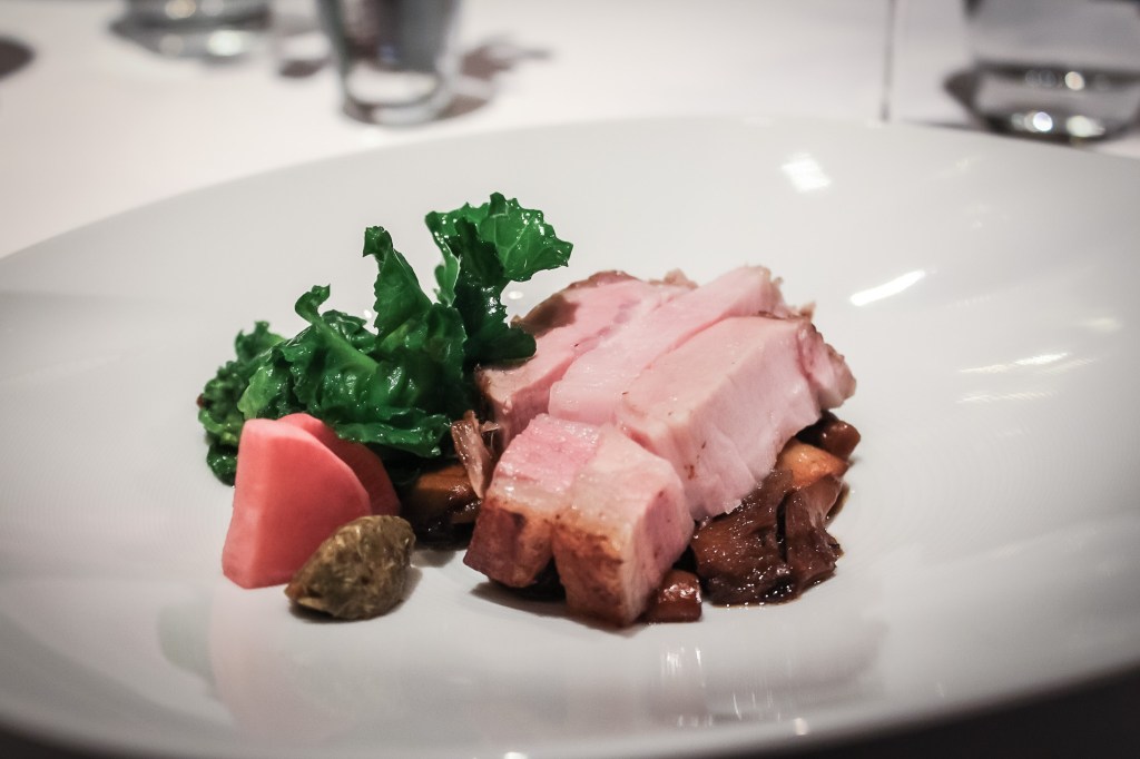 這天主菜是用來自新瀉縣的豬肉,並以牛甘蕈菇襯底,以及醃蘿蔔與青綠蔬菜,還有個特別的日本素材“苳”的香料。
