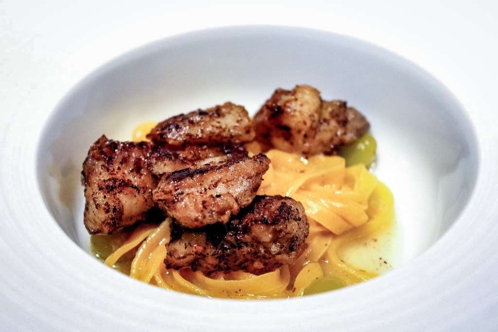 第二道前菜是一款熱前菜了,同樣是採用來自北海道的食材,以炙烤軟骨鰩魚佐上義大利麵,其配菜還有銀杏。