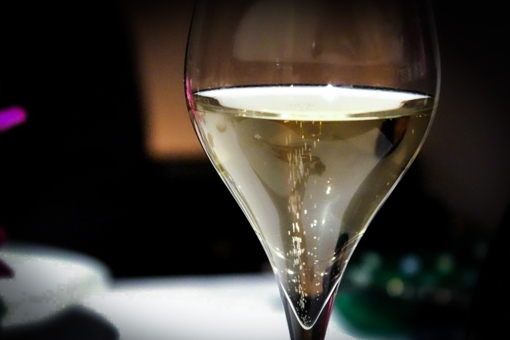 這款義大利Servo Suo Prosecco DOC NV,是北義百分百的Glera品種,侍酒師Kotaro Tsuji 將酒斟入酒杯後,我觀察其色澤,這顏色呈現十分清澈、亮麗、且氣泡十分活潑相當有活力的表現,尤其在美麗的燈光下,它如同琥珀金、也如金箔之美。