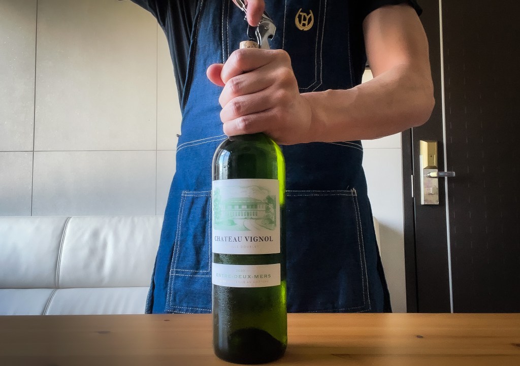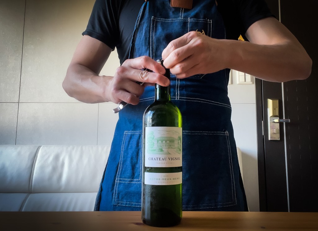 好的,取出我的海馬刀,首先劃開瓶頸的錫箔,然後輕易取下,此時看見這間酒莊的招牌蜻蜓刻印在酒塞上。我展開酒刀,將鑽頭栓入酒塞,再兩段式的酒塞取出,並將它放置一旁。