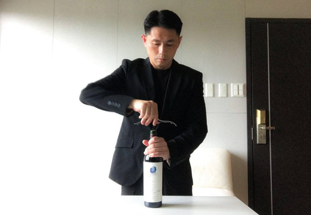 我用海馬刀,輕輕劃開瓶頸的錫箔,然後開起軟木塞,同樣取一杯品質優良的波爾多紅酒杯作為品味,這向來是一個享受品味,注重品牌的人會做的做法。