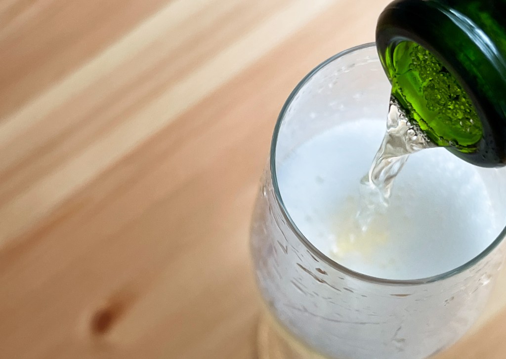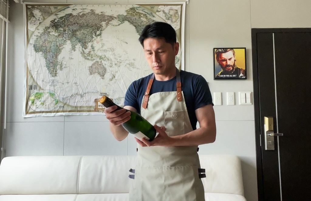 我撕下了錫箔,然後解開拴緊的鐵絲,緩緩的扭開酒塞萊安全地打開香檳。接著,準備好一只香檳杯,然後注入香檳於酒杯內後品味。