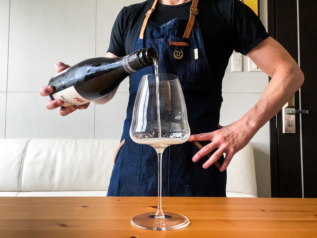 緩緩旋開酒賽後完成開瓶,並且注入Riedel Wings的Champagne杯中。