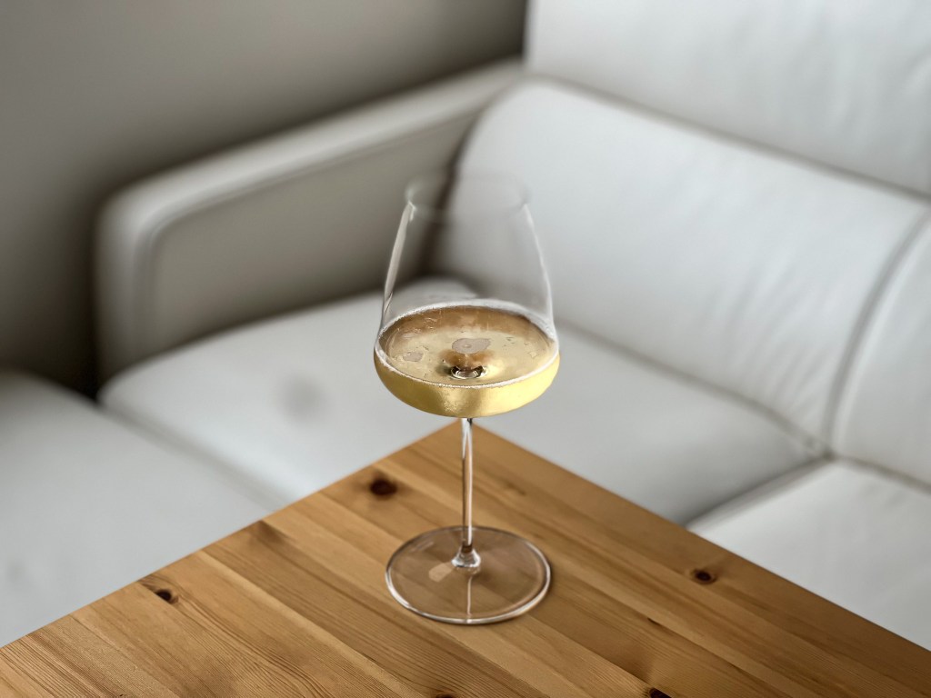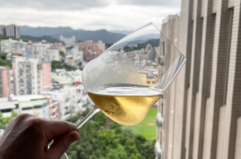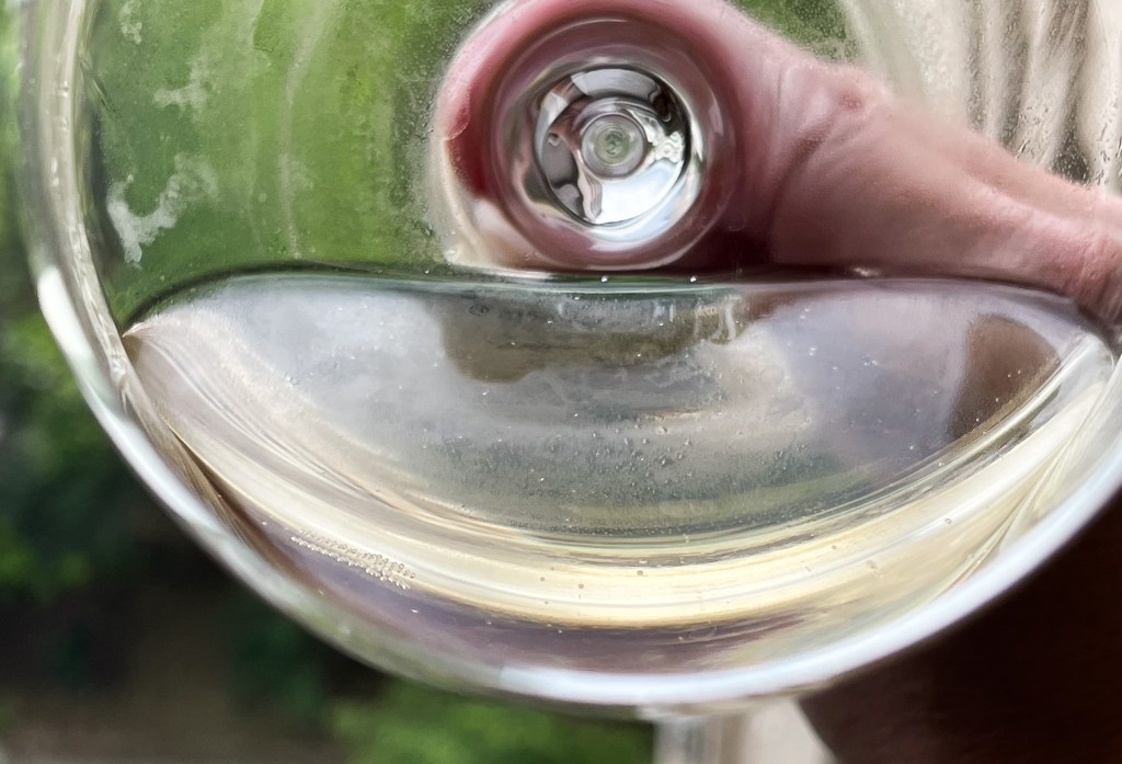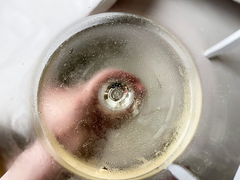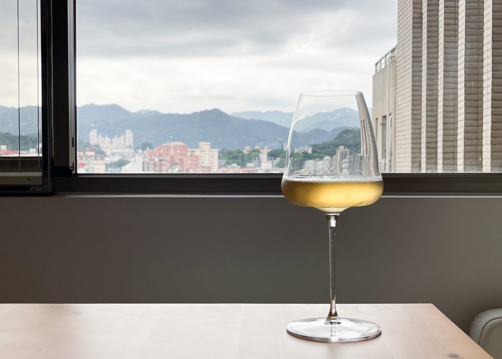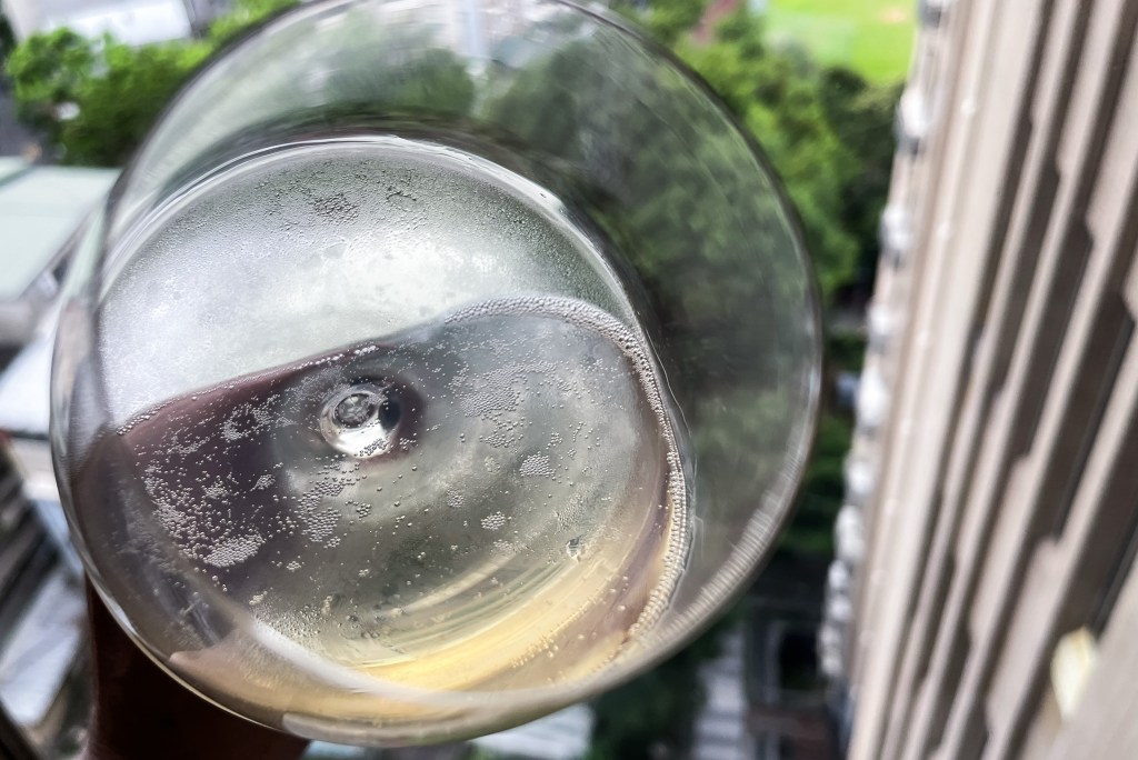氣泡開始時表露於開啟的樣式,蜂擁而上,白色氣泡散發,但收的也快,平靜後剩下零星跳躍,酒痕相對的低調但十分紮實俐落。