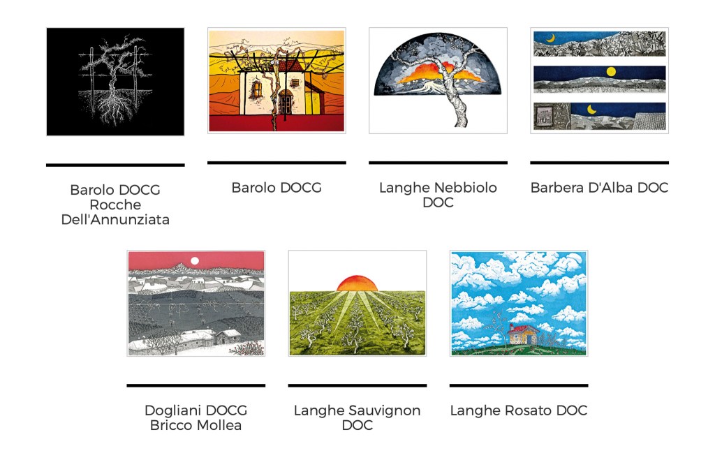 此外,TREDIBERRI的酒標也十分創意,是由藝術家 Pierflavio Gallina創造的作品,他出生於Piemonte的Santo Stefano Belbo村莊,這裡也是作家Cesare Pavese而聞名,Gallina從Pavese的作品而對Langhe山丘充滿熱情。他自從搬到La Morra的工作室後,他已成為Piemonte區最重要的藝術家之一。酒莊透過友誼和對他水彩畫的熱愛,作為每款酒的酒標圖示,他的畫作所表現的流動和色彩完美地實現酒莊的風格和葡萄酒哲學。
