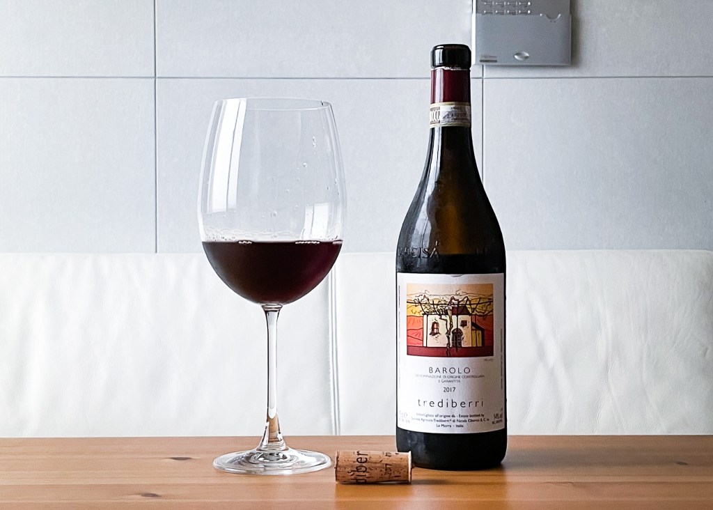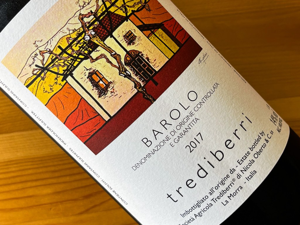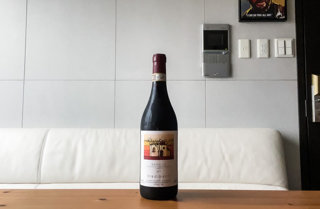 我挑一個有一幅畫作的酒標Trediberri Barolo 2017,先拍幾張它的照片作為品酒日誌照,然後等待運動回來就喝這一款了。