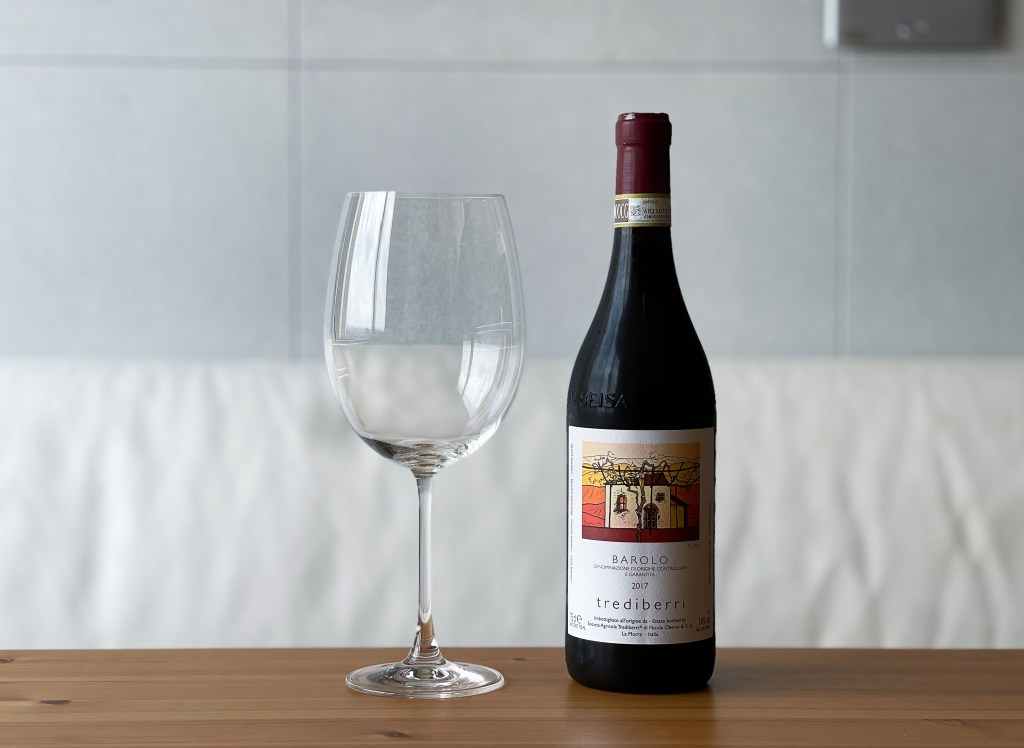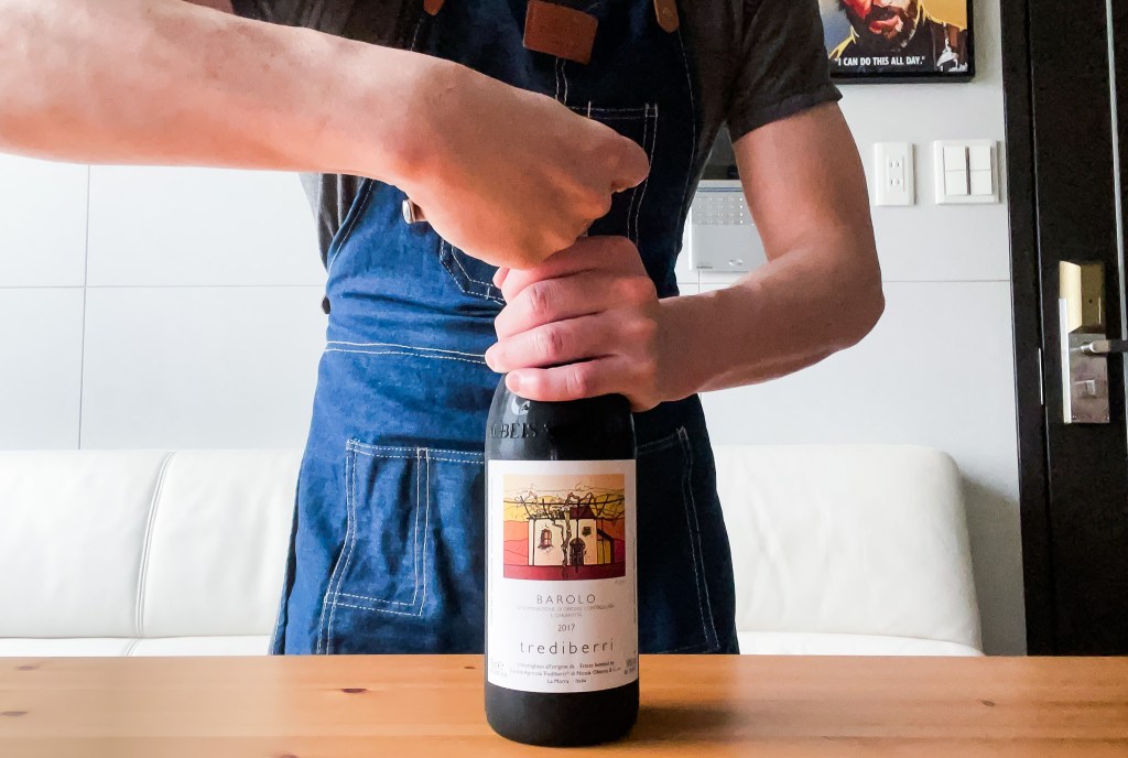 回到家後盥洗,擦拭返家後帶來的水珠後,就是我要品酒的時刻了。我將Trediberri Barolo 2017取出,用海馬刀依照順序取下酒塞,並也準備了一個Nebbiolo 的酒杯,作為今日品酒之用。