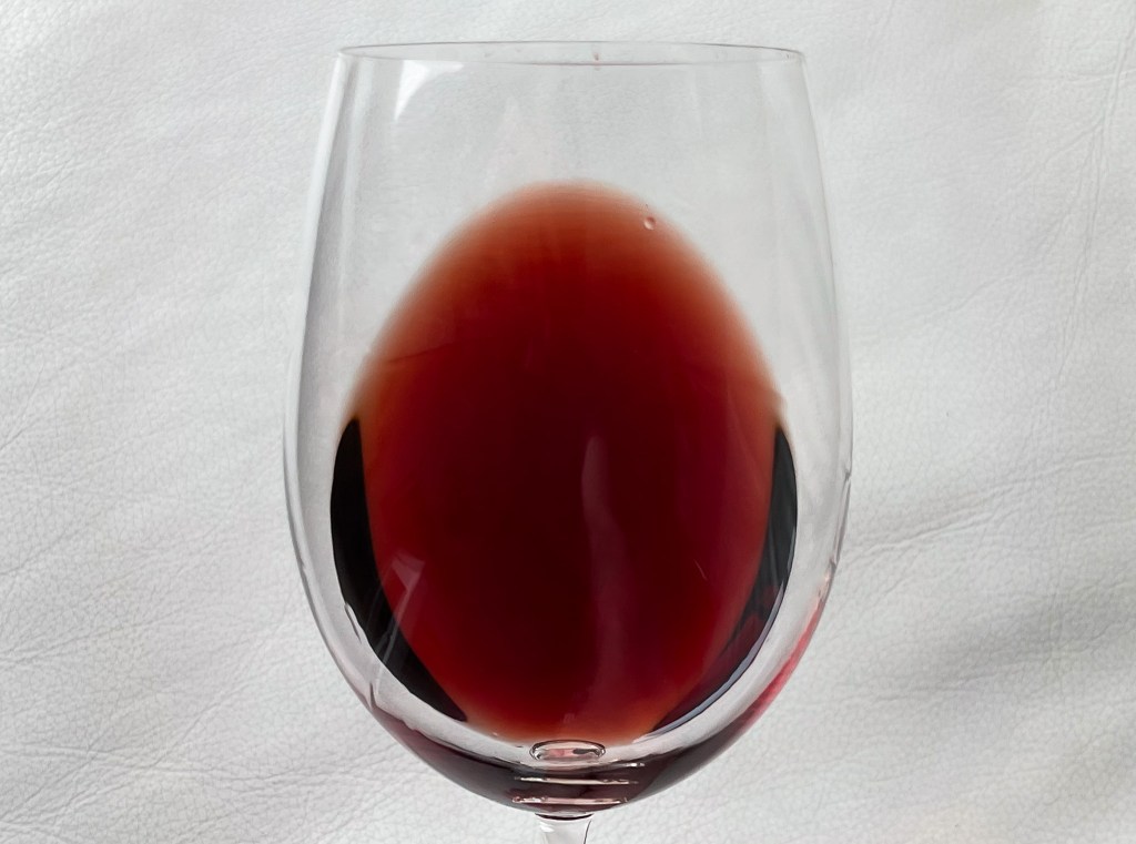 鄰接的色調是膚色也偏茶紅,然後由親民可愛的、梅果紅、桃紅接力,才進入酒體的磚紅、寶石紅,在背光下,形成色階層次,但酒體反而形成渾厚紫黑。