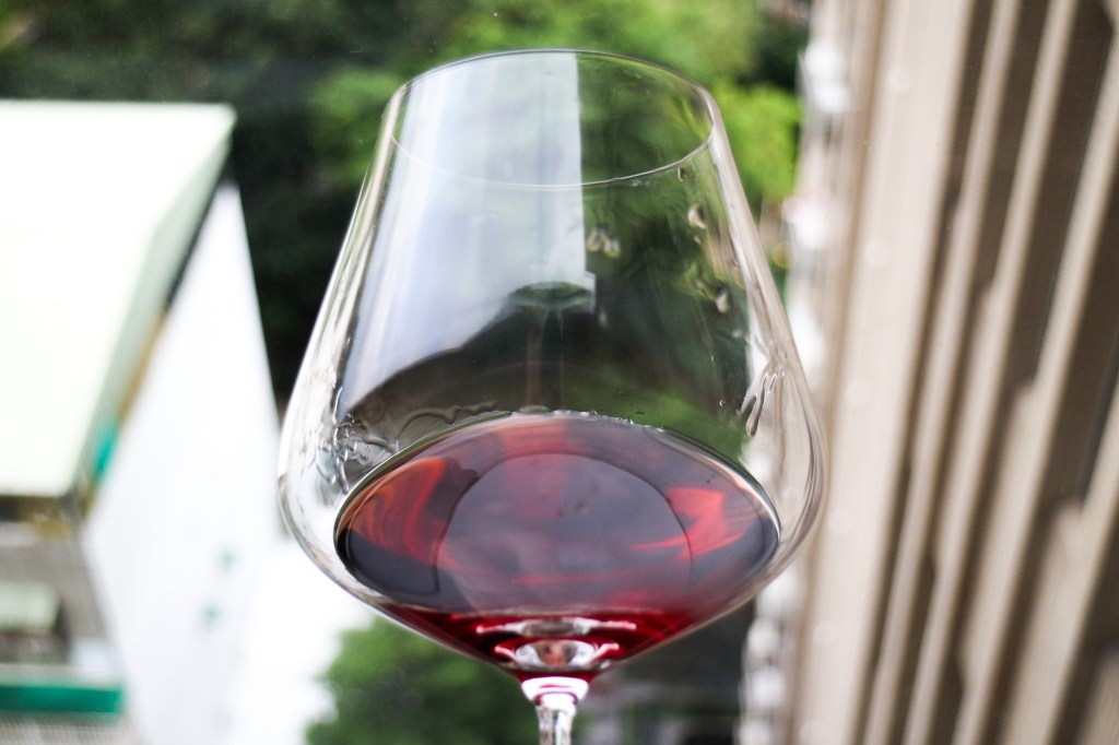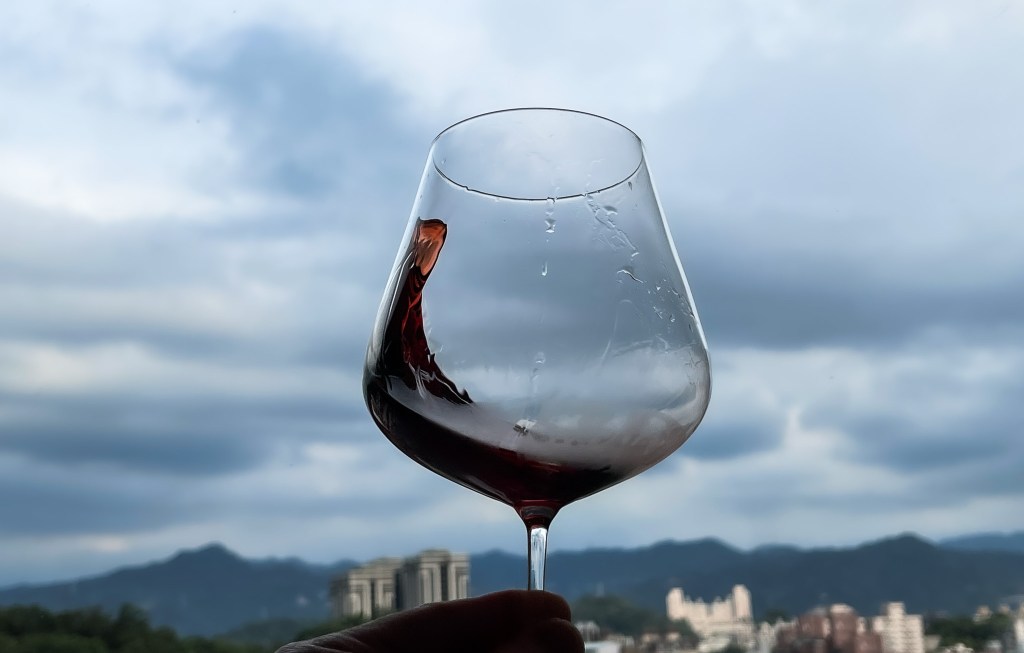 接著,我搖晃酒杯,觀察其俐落之腿,細緻優雅地滑落過杯腹,沿著酒杯頭與酒杯杯型畫成弧線美麗,酒面明鏡乾淨感。