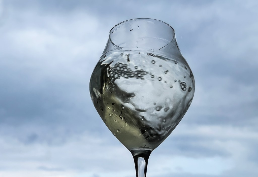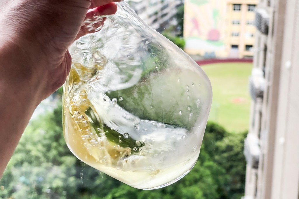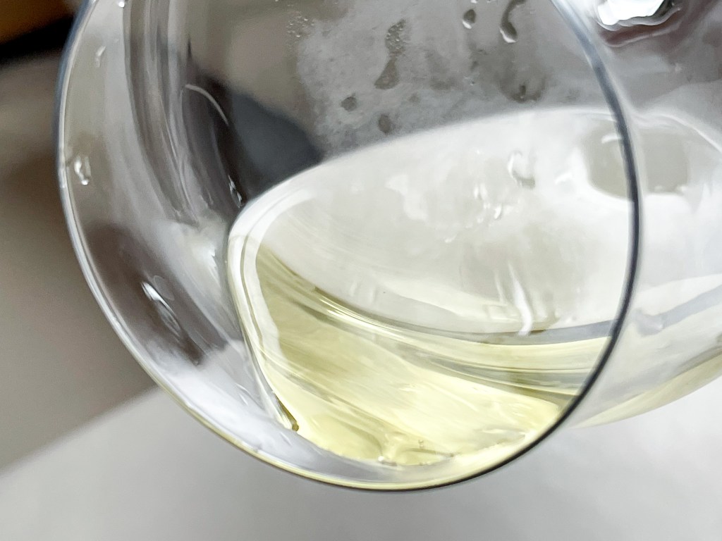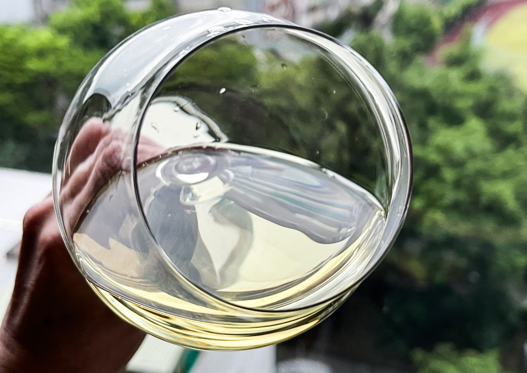 我搖晃酒杯,酒腿俐落乾淨的滑落而下,透明優雅,酒面純淨如晨間雲霧之美。