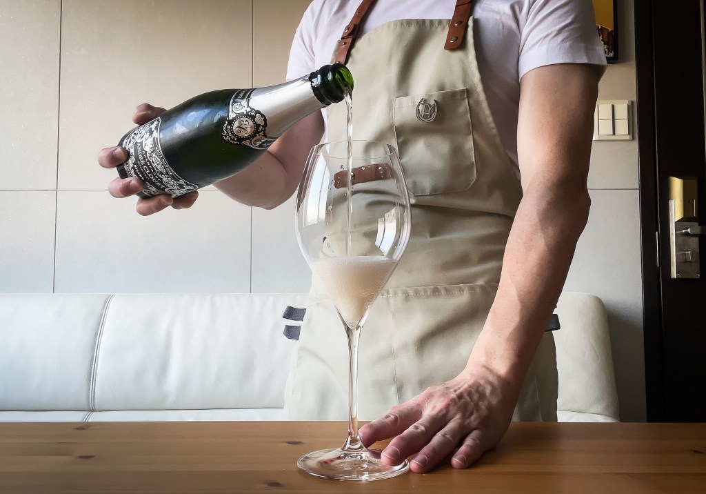 拿出Champagne Andre Clouet Silver Nv,輕鬆的開啟他;此外,我刻意準備這款Pinot Noir酒杯,除了細長外,也灰映這款100%Pinot Noir釀製的Champagne 。