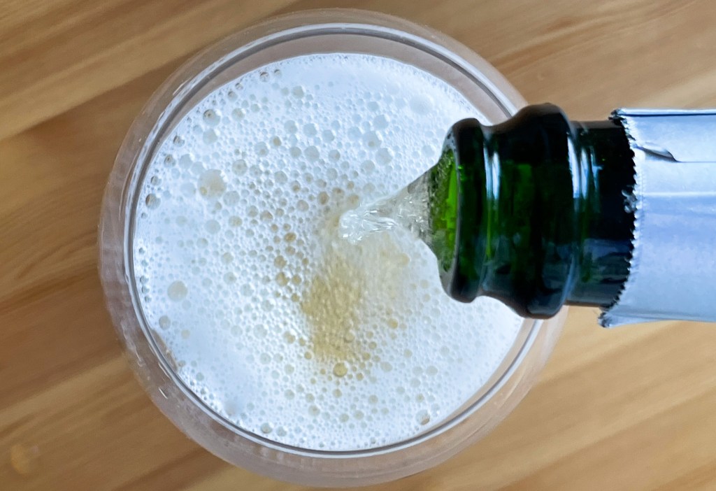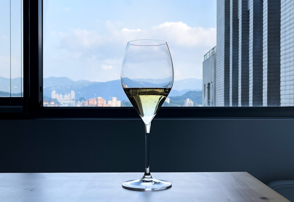 我將香檳注入杯中,這道氣泡蜂擁,當香檳水柱進入杯底竟然是雙倍反作用力的讓酒彈跳了出來,白皙雪白的浪花,非常刺激也像小孩一樣活潑。好的,接著準備品味他吧。