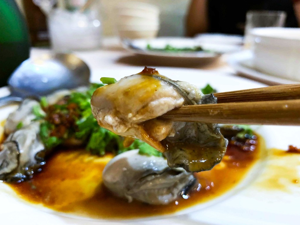 第三道是「蒜泥香蚵」,這道照料的擺盤,直覺讓我想來碗白飯,不過我吃了這塊挺為肥美的鮮蚵,質感是滿意可口。除了蒜香調味讓我覺得恰到好處,而蚵肥美厚,且仍以半生食表現,這道挺適合嚐鮮的。