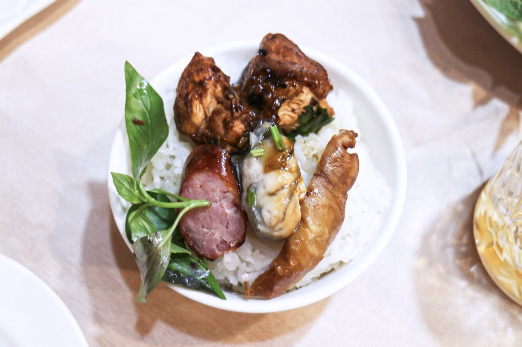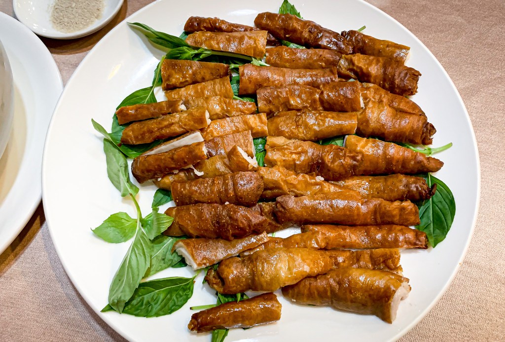 這道把肥腸炸的外皮酥脆,內裡柔嫩而軟嫩的肥油脂滋味,咀嚼時在口感上相當美味。我試著捲個九層塔,再入口。表現出新鮮的,帶些澀香的味道,然後還有油軟脆皮味,好吃可口。