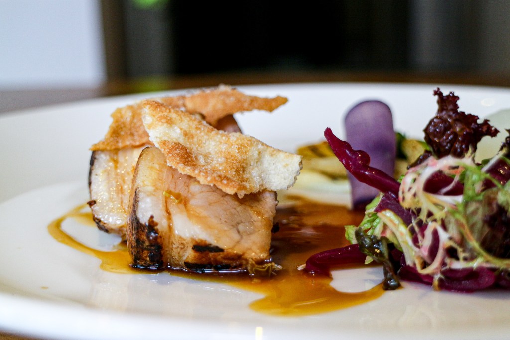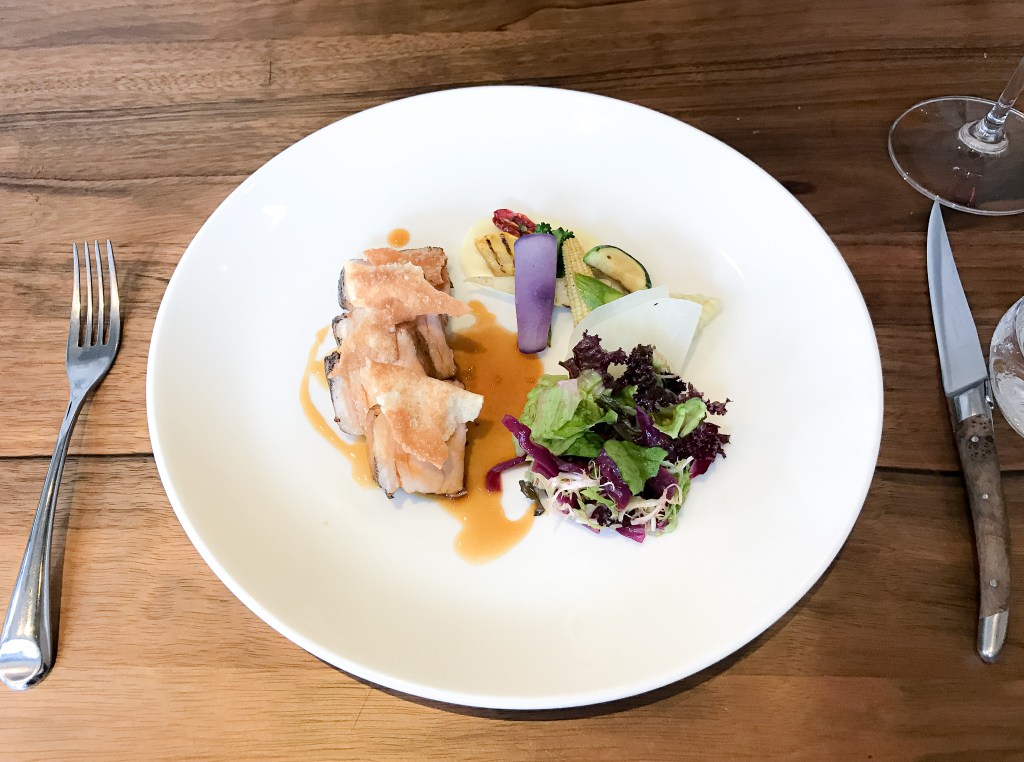 第四道料理是今日的主餐「焦糖鹽漬豬五花佐花椒八角豬汁及酸甜蔬菜沙拉」。很認真的聽服務人員的詳述,這是一道低溫烹調14小時的豬五花,另外用花椒還有八角調製的醬汁作為醬汁搭配,這外型看起來或聽起來,都似乎會感覺是一道味道很強厚的主菜。