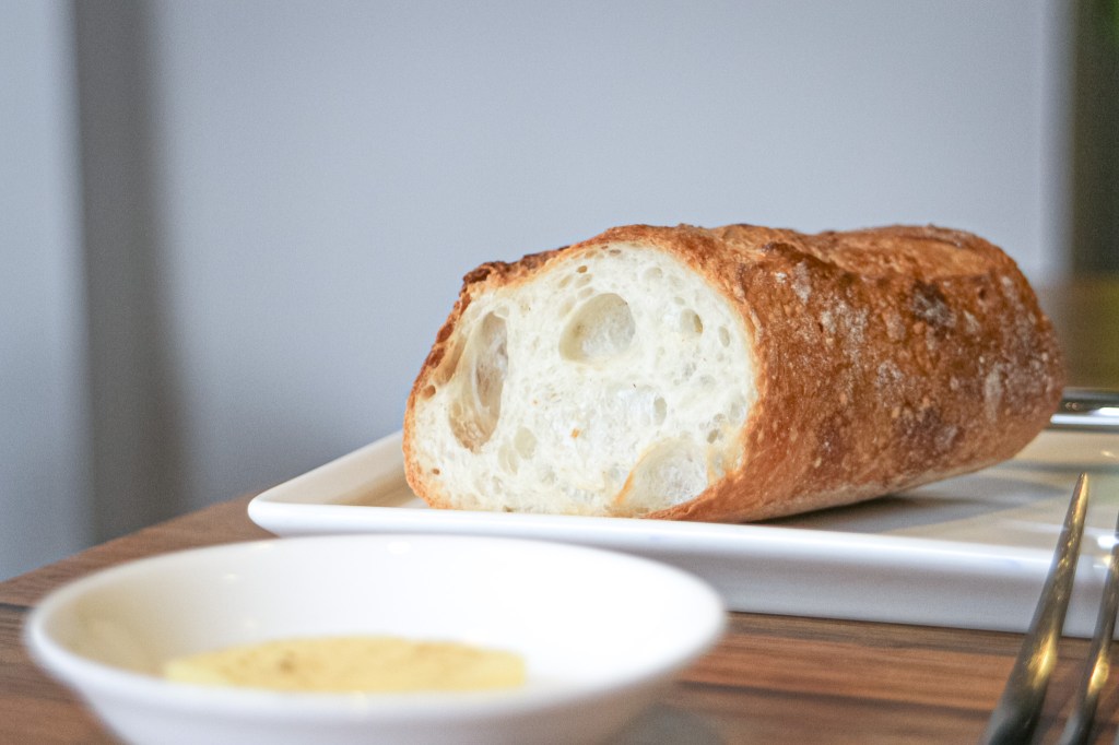 好的,還在享受與品味葡萄酒滋味時,餐廳的法式棍子與奶油搭配的麵包,會作為開胃點心。取起法式棍子,抹刀挖上一部奶油塗上些,入口咀嚼,雅量麵包清香,滑順滋味的奶油,整體搭配十分開味的。