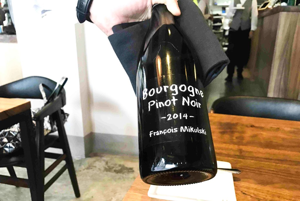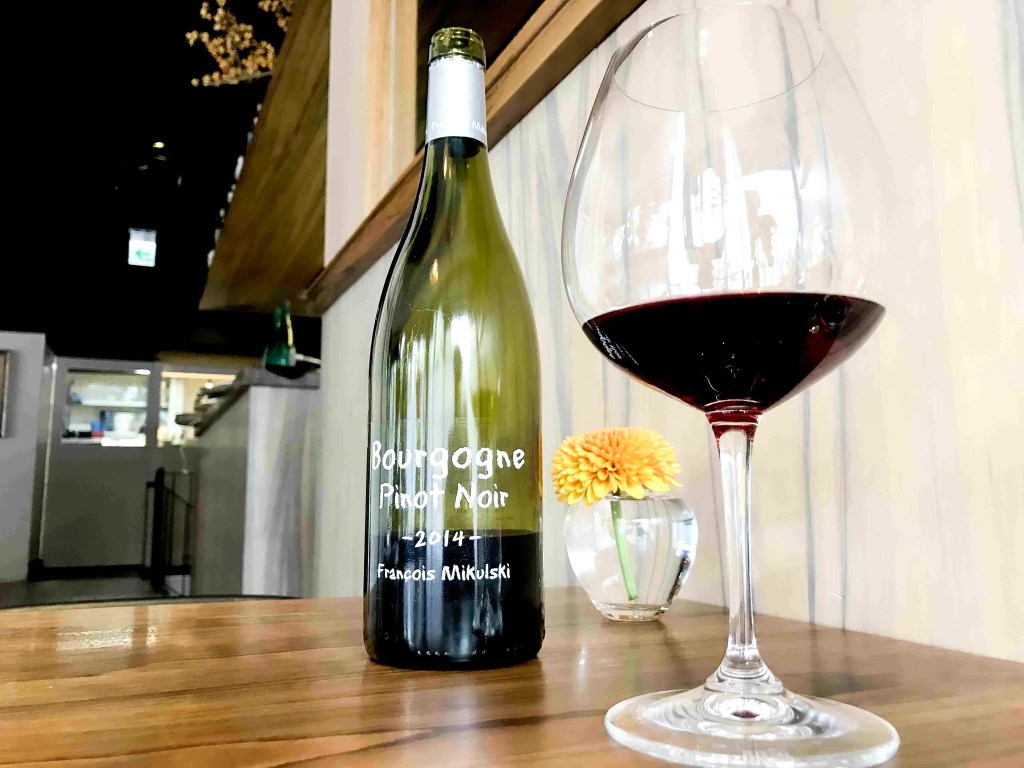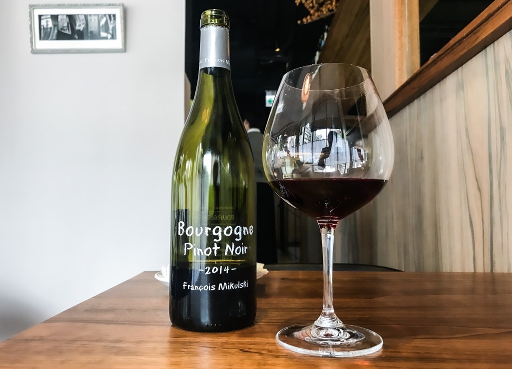 今天就不開自己帶的葡萄酒,我在餐廳裡選擇了一支高貴不貴卻很有魔力的布根地葡萄酒Francois Mikulski Bourgogne Pinot Noir 2014(產地:France 產區:Burgundy, Meursault 葡萄品種:100% Pinot Noir)。