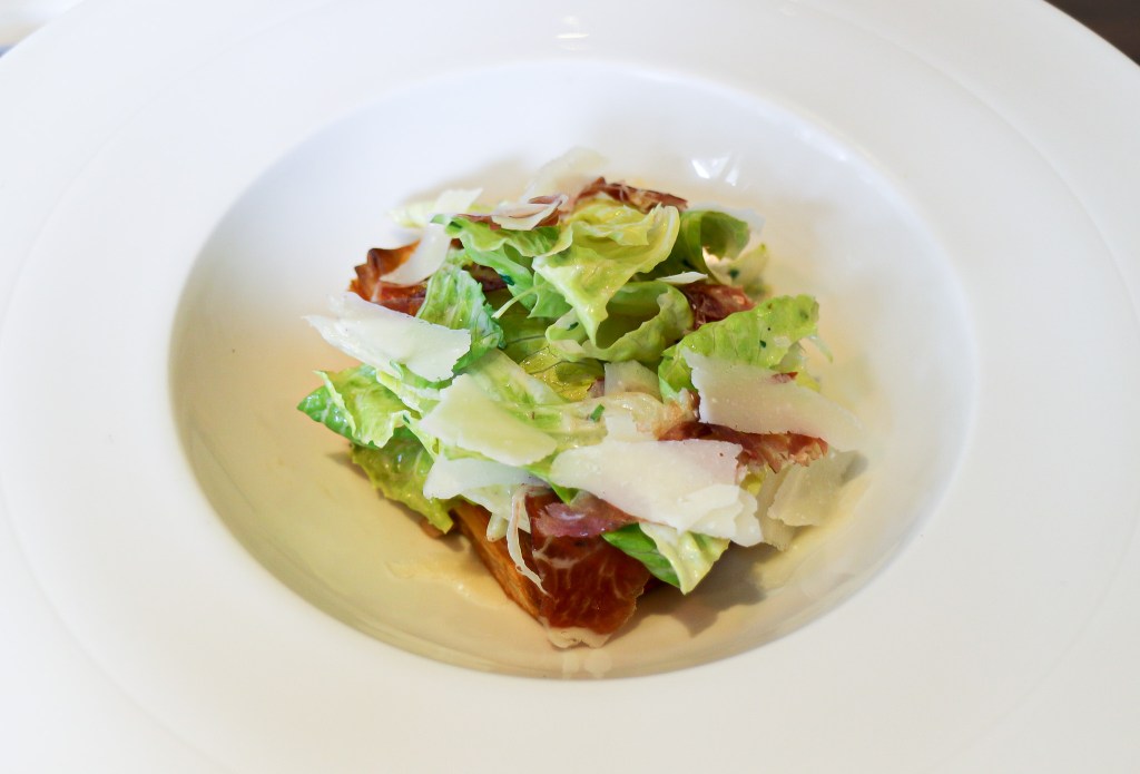 第二道料理是「綜合菇酥皮塔佐松露油醋蘿蔓沙拉及伊比利火腿」。相對於開胃菜,而這第一道前菜則也是以酥皮佐四種菇與杏鮑菇..等,上頭襯蘿蔓佐松露油的沙拉,另外也加上伊比利火腿,還有刨上些帕瑪起士。