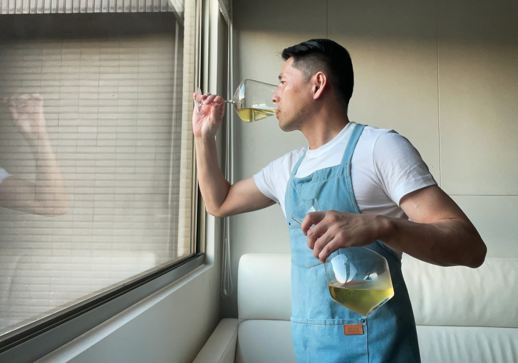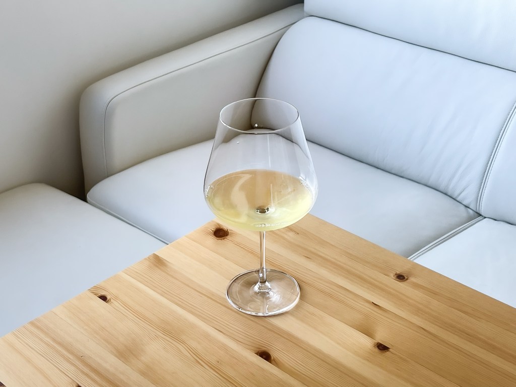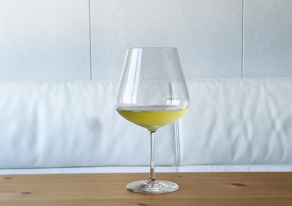 我把酒杯靠近鼻子,聞一下氣味,青草植物香、野花小白花細微,接著感受有點濃縮焦糖、黃金糖味,鳳梨、桃子、微微百香果、然後感到一股微微礦感以及鹽味。