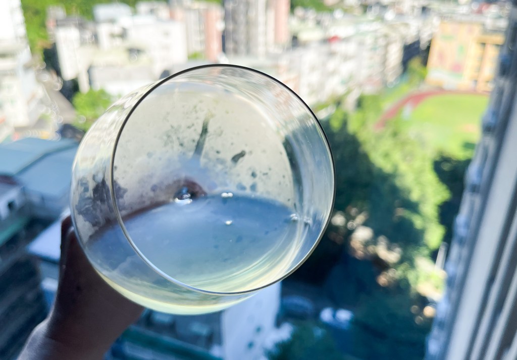 搖晃酒杯,酒腿俐落而下,俐落乾淨,酒面平靜、優雅、清新感。