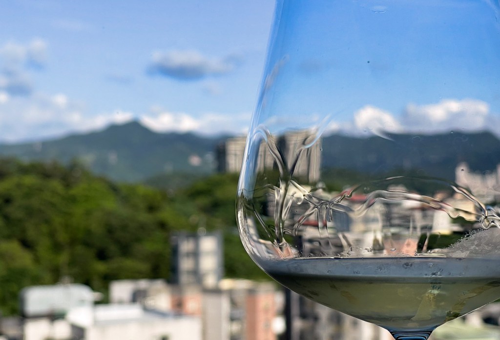 回到家後,這天氣雖然熱,但晴空與白雲,讓人心情大好,遠遠的山處清楚的貓纜,此時品酒最美。