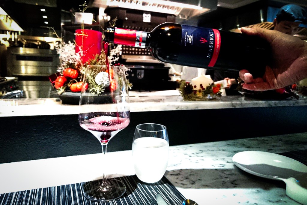 好的,待一切安定後,我向侍酒師說明帶自己的葡萄酒Maserati Barbera d’Asti DOCG Superiore 2010(產地:France 產區:Piemont , Barbera d’Asti葡萄品種:100% Barbera),侍酒師也具有專業的服務與精神做侍酒服務。