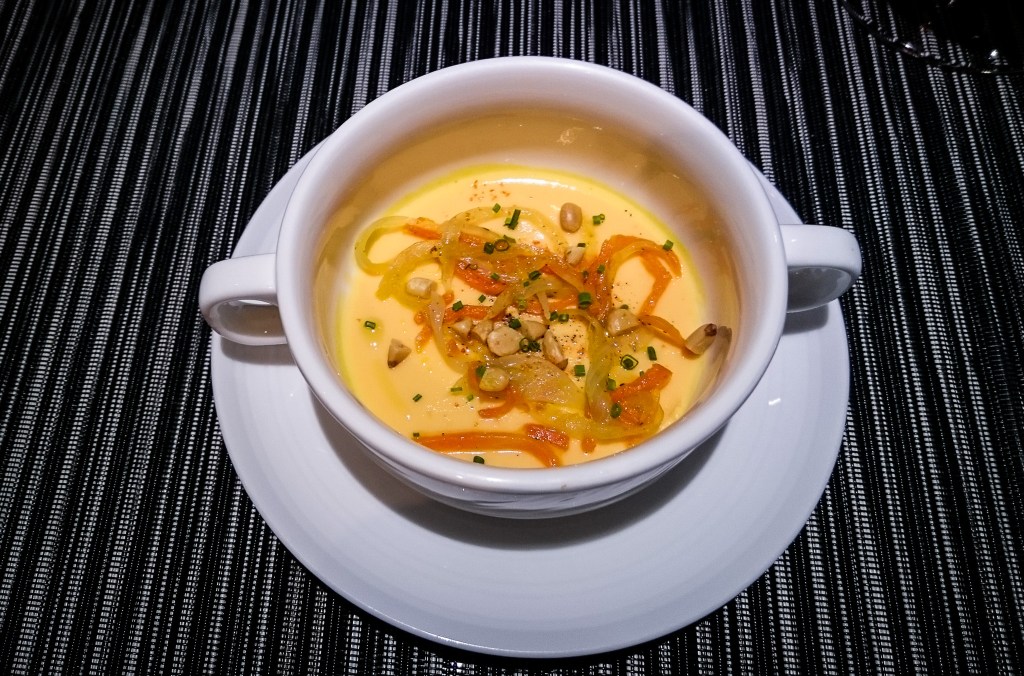 今天午餐的第一道料理是開胃點心「蒸蛋」。開味菜是一款以紅白蘿蔔製作的蒸蛋,隨之所配的料理還有杜松子、紅白蘿蔔絲等等,欣賞了一番,蒸蛋就就如初入社會的仕女,設計著帶有著一種聰穎。攪開吃下,氣味香濃美味,而口感是那麼的嫩緻,輕柔與細緻的滋味,很美味的小料理。