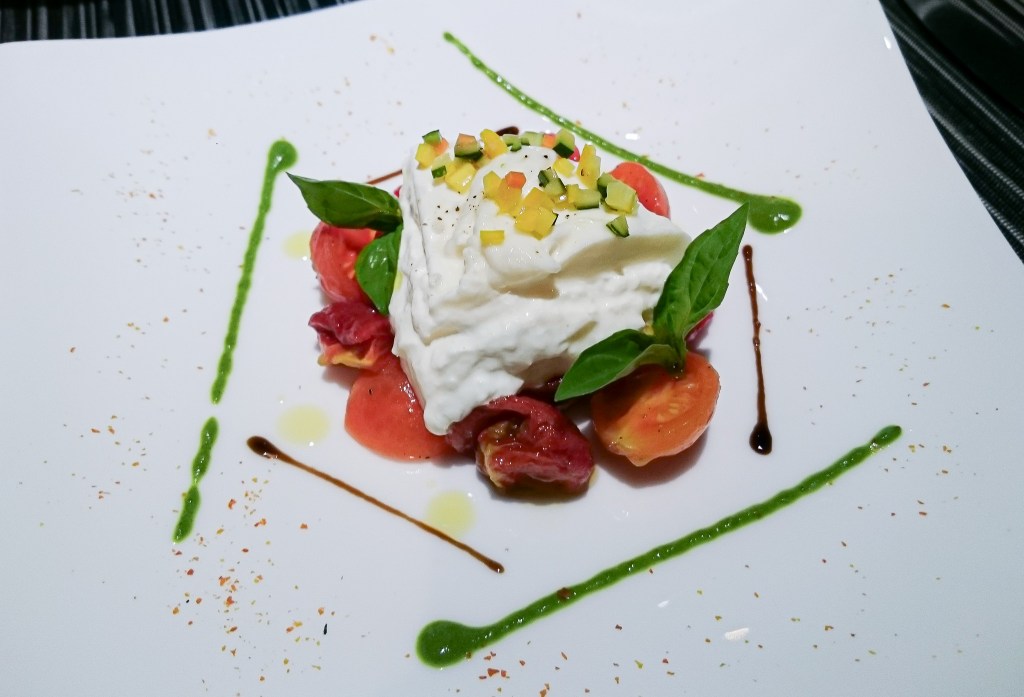 第二道料理是「布拉塔起司佐食蔬」Tomatoes Jelly with Burrata, brasil and balsamico。Angelo餐廳是臺北L’atelier de Joël Robuchon的行政主廚,因此在菜單設計方式與風味,就如他在習政主廚時期一樣的風格。而我冷前菜選擇了一道比較適合搭酒的起司料理。這用馬佐拉起司、油封番茄、新鮮番茄、蘿勒葉、甜椒丁等材料調製,還有用巴西利打的青醬,當然少不了一些油醋。