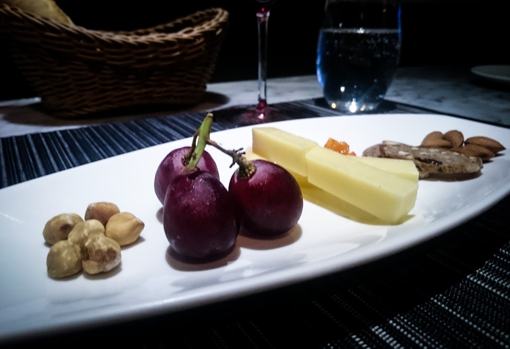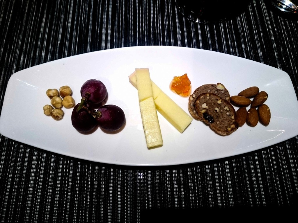 緊接著第四道額外的單點搭配飲酒的料理由Comte, French Cheese組成的「起司盤」。對的,在主餐登場前,依侍酒師建議可以搭個起司來細細品嘗葡萄酒,我想也對,就是享受。