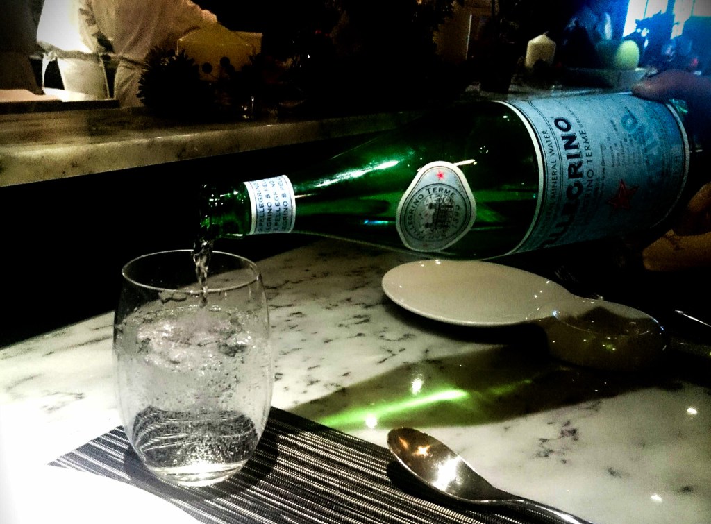 今天的飲用水S. Pellegrino「聖佩黎洛氣泡水」。在剛坐下後,通常餐餐的服務人員會問要礦泉水或氣泡水,我個人習慣,喝葡萄酒時比較喜歡配汽泡水去味,而餐廳的氣泡水也選用自義大利品牌的氣泡水了。