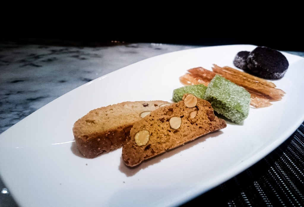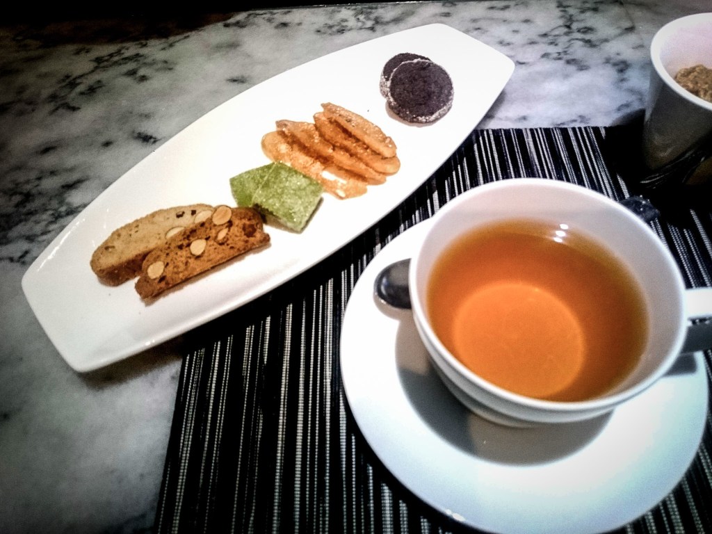 最後的茶點Petit FoursFruit「乾果餅乾、抹茶糖餅、乾脆餅乾以及糖霜巧克力」。餐後也有配一杯我所選擇的伯爵茶。