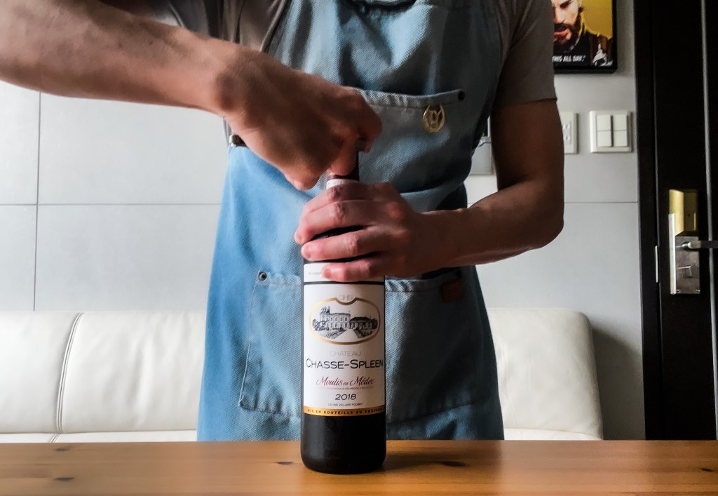 所以一到家就開啟了冷氣,盥洗,讓全身放鬆清潔,再來品味葡萄酒,那正是假日的大大享受。我取出葡萄酒Château Chasse-Spleen2018,開啟了它,拿著準備好的葡萄酒杯,將葡萄酒注入,開始今日的品味旅程。