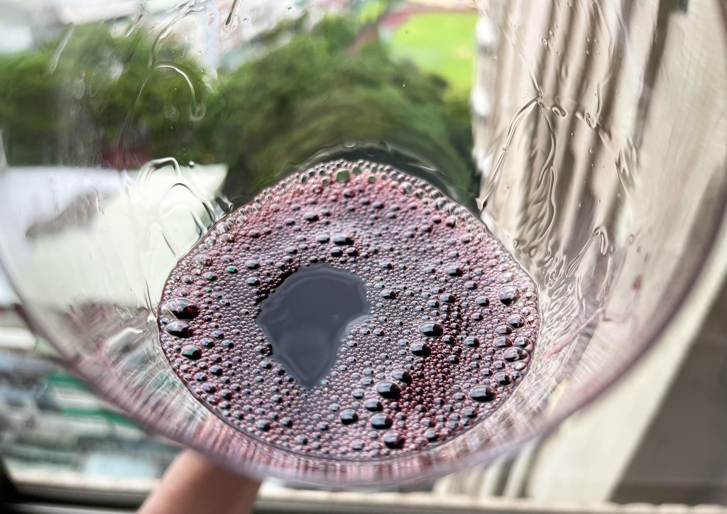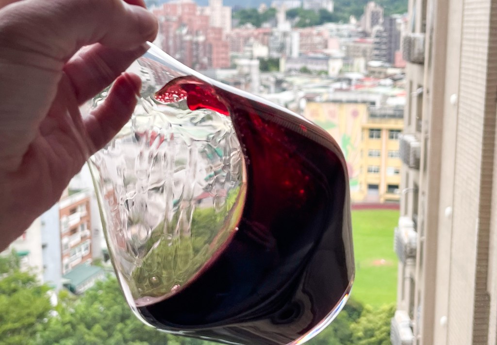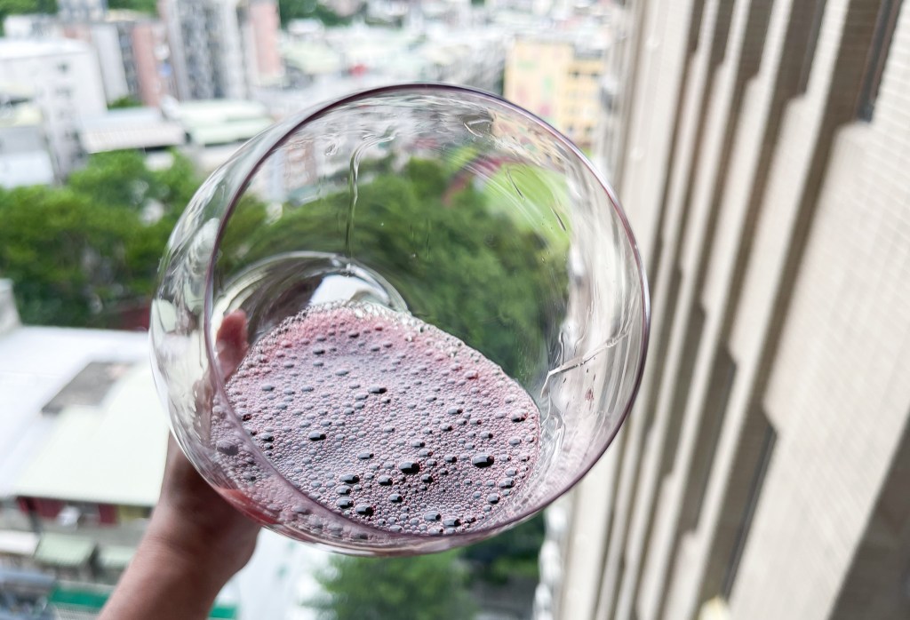搖晃酒杯,優雅帶著桃紅色的酒也的酒腿細緻滑落,表現優雅的質地,酒面潔淨呈現無暇的瓊漿玉液。