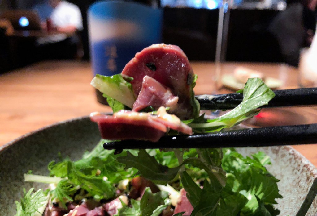 再下一道嘗試的小食「煙燻鴨胗/第戎芥末/辣椒油/小生菜葉」。