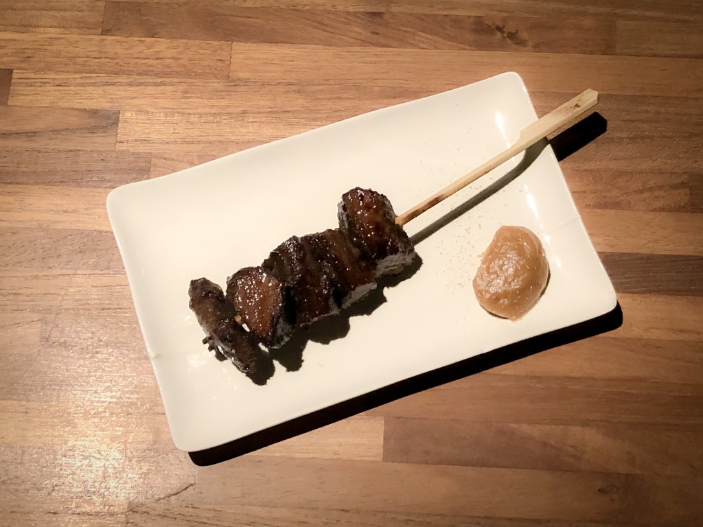 果然是牛肋條,在串燒下,外微微脆溫熱,搭上烤肉醬汁,甜香鮮美。肉汁經過咀嚼,爆出油香光滑滋味,這是最喜愛的感覺。