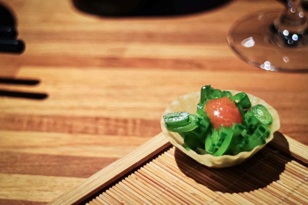 接著是點的第一道小食,因為冷涼食物陸續接…那一道一道來吃,一樣樣來搭配葡萄酒,先來吃這道「甜豆小塔/蛤蠣美乃汁/明太子」。