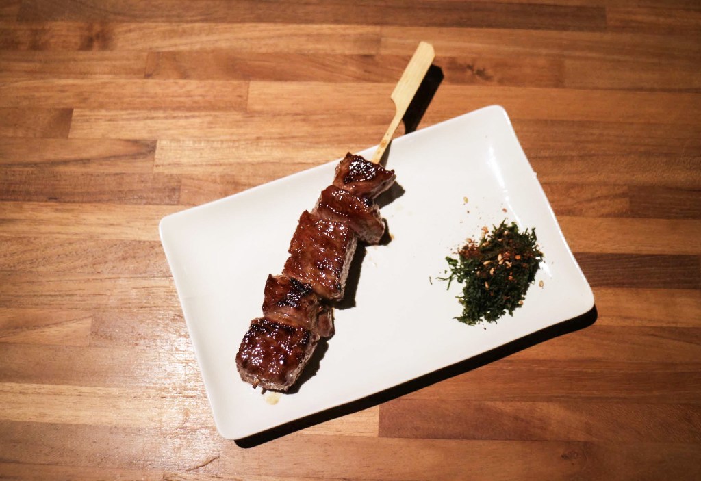 第六道料理是烤物肉串「牛肋條/洋蔥酸奶/孜然」。