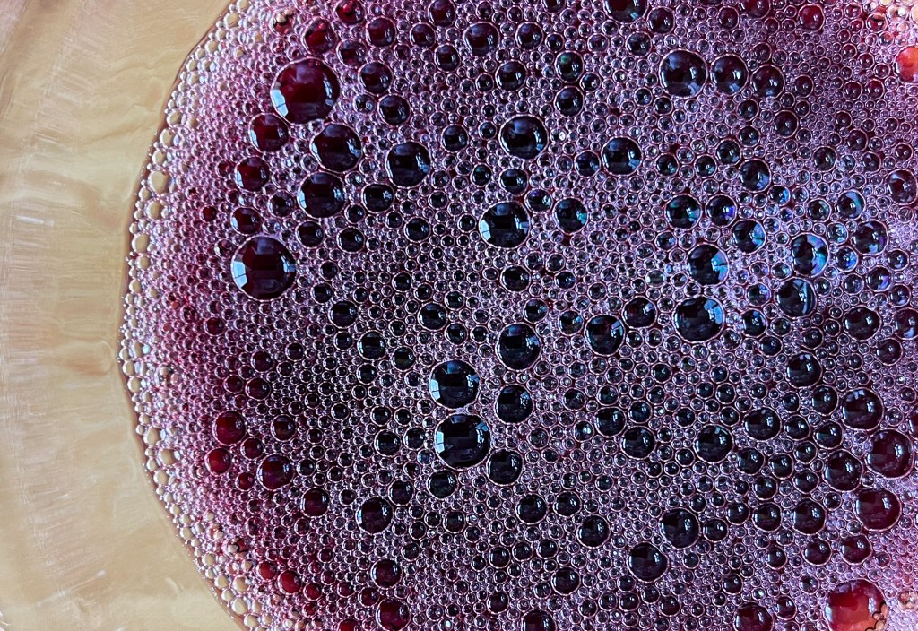 我再搖晃酒杯,然後深聞,有些黑李、黑櫻桃、黑莓果,紫羅蘭花香,當酒杯拉遠又表現出一股紅醋栗、覆盆子酒漬的甜香調性。