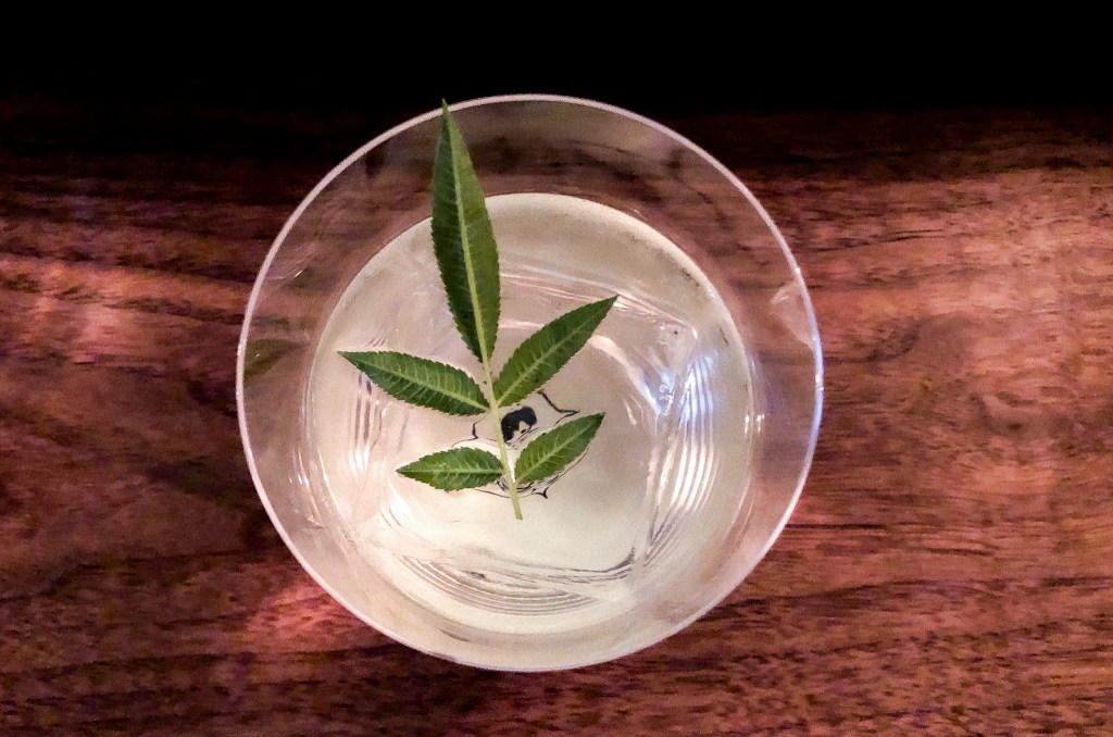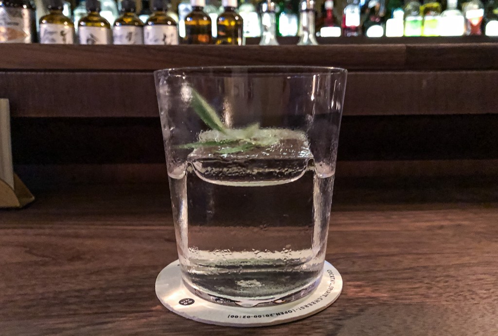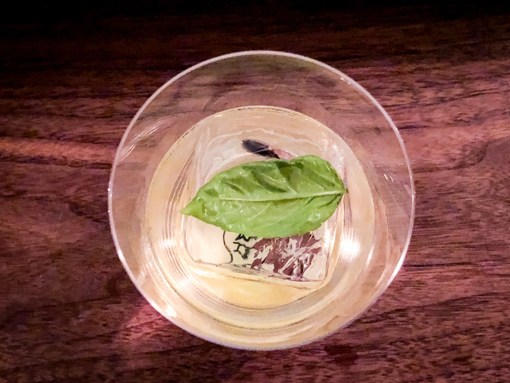 這杯調酒透澈透明乾淨,一片芳香萬壽菊葉,其意境猶如溪流上的漂流葉,能帶來溪水清新涼爽的芳香味。