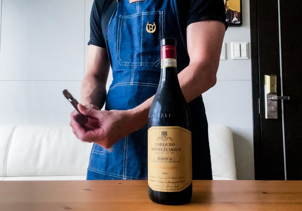 我準備好了一支Nebbiolo的酒杯,準備好了醒酒器,準備好了海馬刀,穿上了圍裙,便取出了Cordero di Montezemolo Monfalleto Barolo 2016。