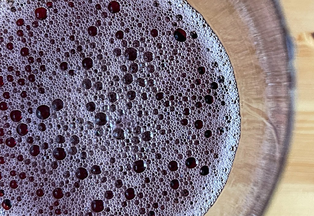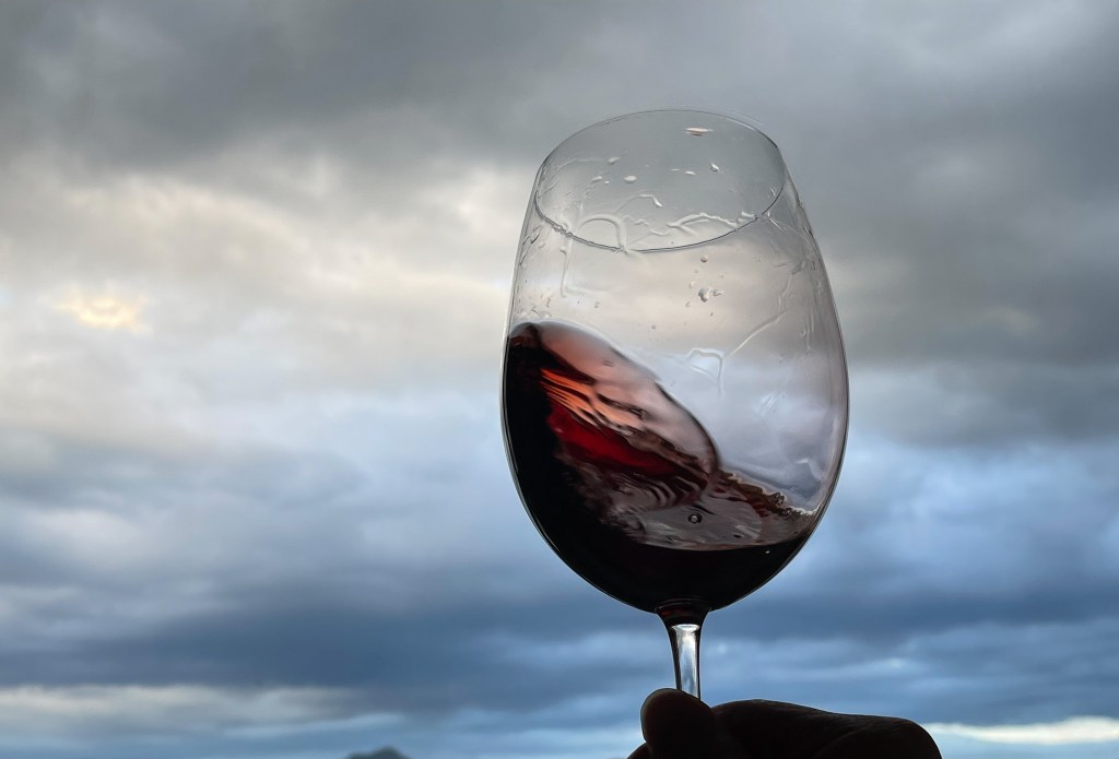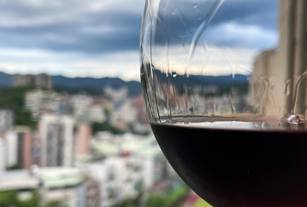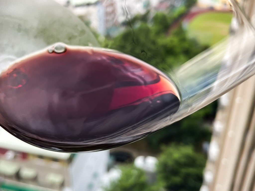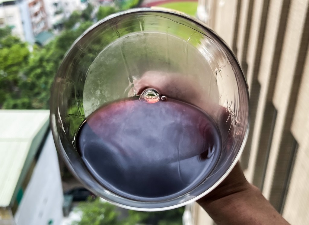 當進入酒體時,則呈現茶紅、桃紅、磚紅、然後變成主體的紫紅及紫黑。
