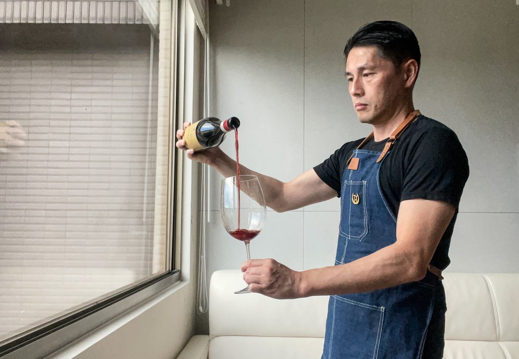 我開啟了葡萄酒,取起了軟木塞,緩緩地將酒杯移致前方,我手握瓶底並注入葡萄酒於酒杯之中,看看那幽雅的紅寶石酒色,變勾起想品味之心了。