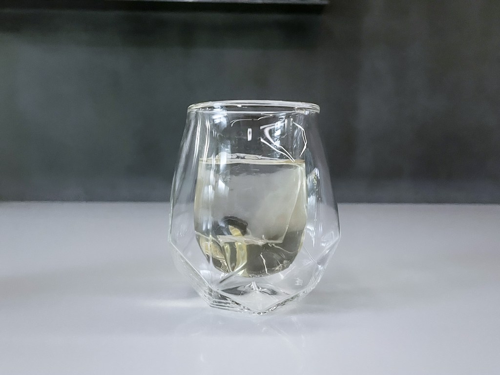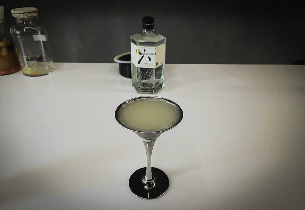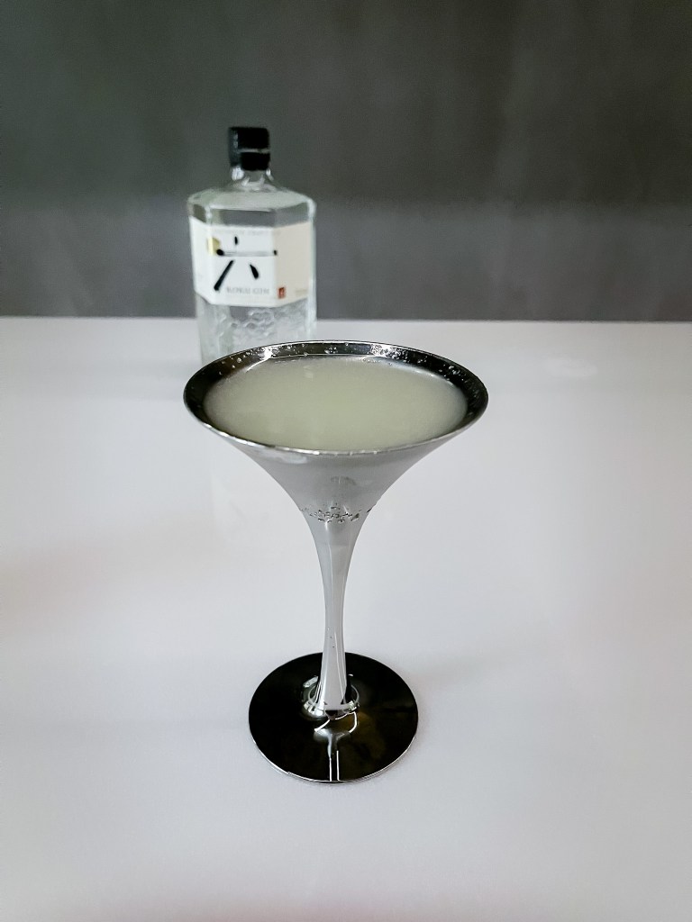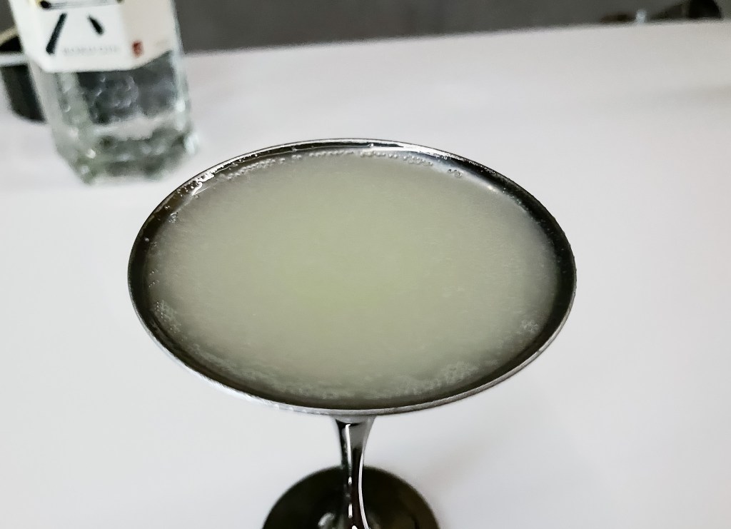 這一杯是以銀器且有重量的馬丁尼酒杯呈現,因為製作的溫度低,用銀器保持低溫合理。