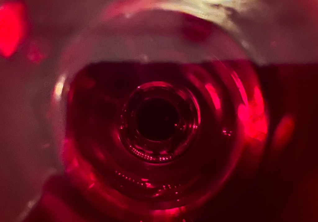 好,先觀看酒緣,酒緣透明光澤,在酒館裡雖然受到燈光影響,而我以平視的角度來觀察,它猶如一層比重大的油脂漂浮在上層,由於溫暖黃光,照耀著酒杯依然呈現明亮可觀看的畫面。