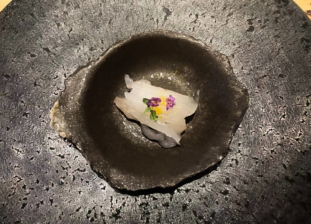 師傅建議先吃原味,我吃下後果然不負我所想,甜蜜稠甜,脆斷好吃。再有紫蘇花柚子鹽的搭配,香而刺激,同時有維持甘甜稠密滋味,這就是壽司店無與倫比的表現。搭配清酒,又是種甘醇乾爽感,帶著甜美舒適的滋味,就是甜稠如吃水果一般。