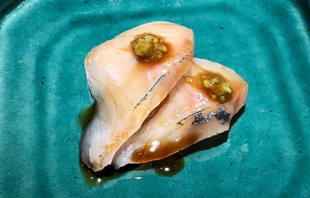 這兩塊經過四天熟成的縞鰺,它的滋味真是美好,入口有圓潤、綿稠、黏甜、甘柔等等一層層甜美而舒服的滋味,咀嚼時感受中間微微脆斷,但持續可口甜蜜的口感,這真好吃。搭上清酒,太棒了如此甘甜,尤其在尾韻決勝負,回甘而好吃。