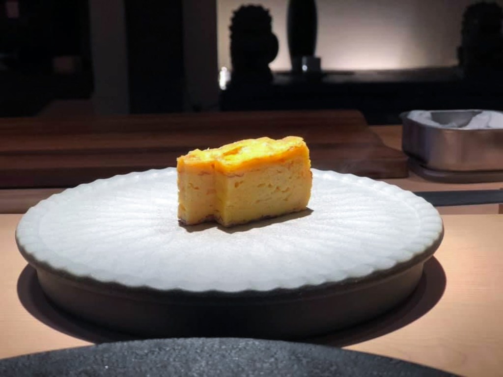 最後是玉子燒,兩片經典玉子燒,不過是以熱燙呈現。其滋味亦是甜蜜甘香,不過燒薄讓外皮微脆可口而不乾。甜美後,還有微微蛋香氣。搭上清酒,舒服而搭配,兩者均甜確實甜美回甘。